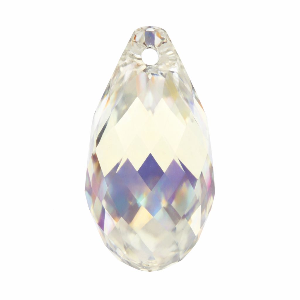 Piedra en forma de gota de color Crystal AB con dimensiones de 13,0 x 6,5 mm. Cuenta con un orificio pasante en la parte superior más estrecha, lo que permite colgarla. La base transparente con recubrimiento AB ofrece un efecto iridiscente según la luz. Adecuada para joyería, elementos decorativos y proyectos creativos.