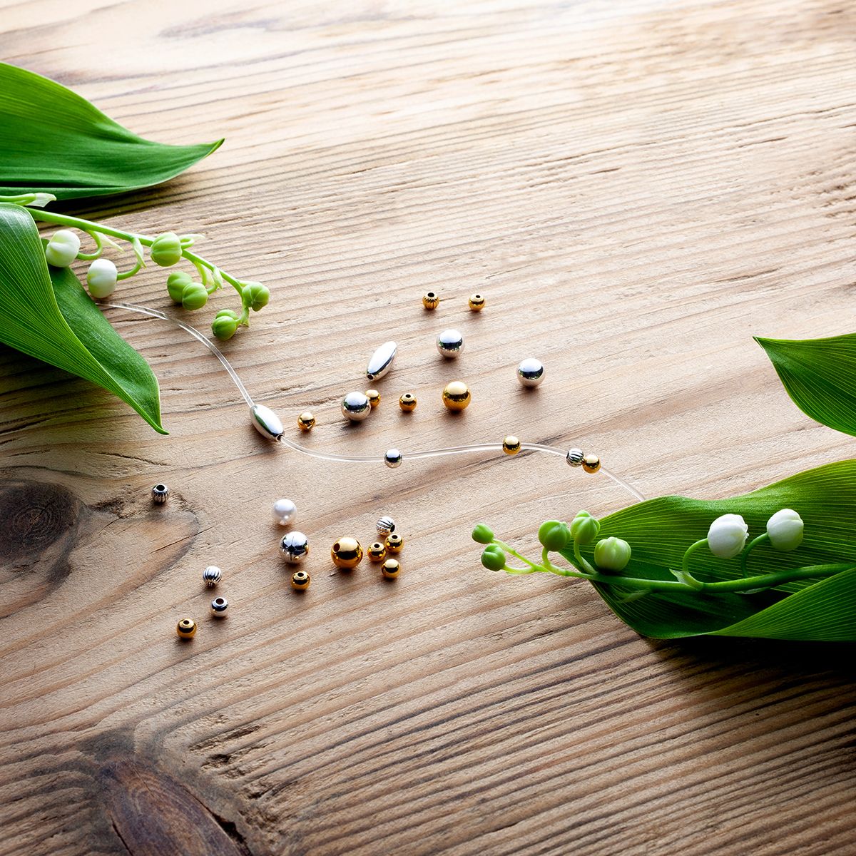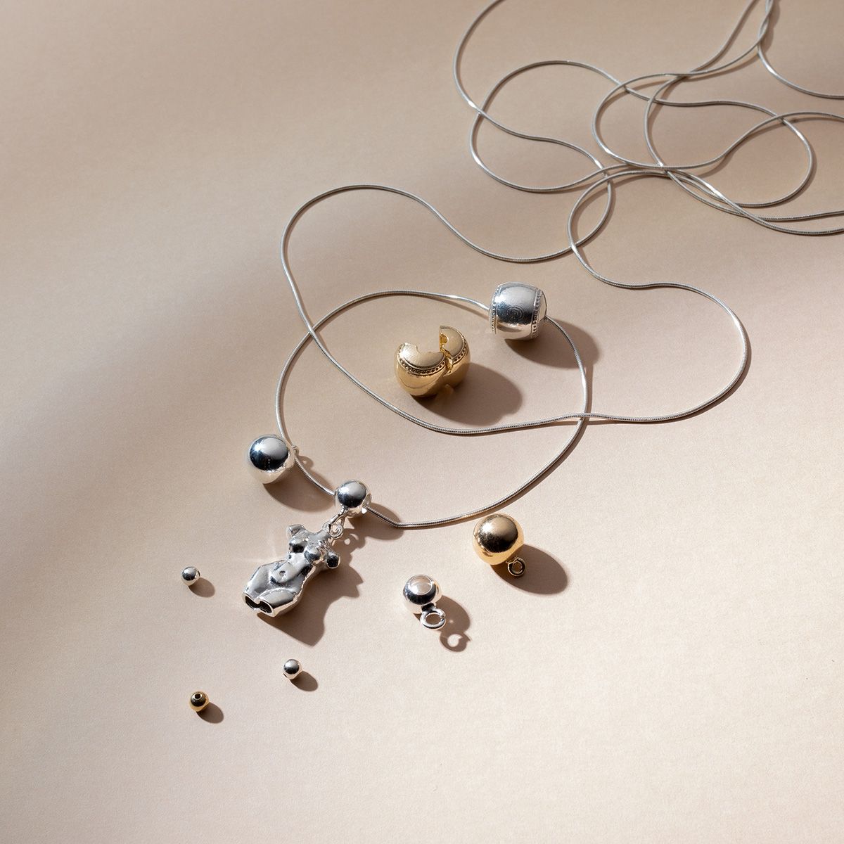 Las bolas de plata cumplen muchas funciones – desde decorativas hasta prácticas. Pueden usarse como terminación estética en el soporte, como separador entre piedras, perlas, cuentas, o como tope funcional que evita el deslizamiento de los detalles decorativos. Un componente pequeño que influye notablemente en el aspecto final de la composición.