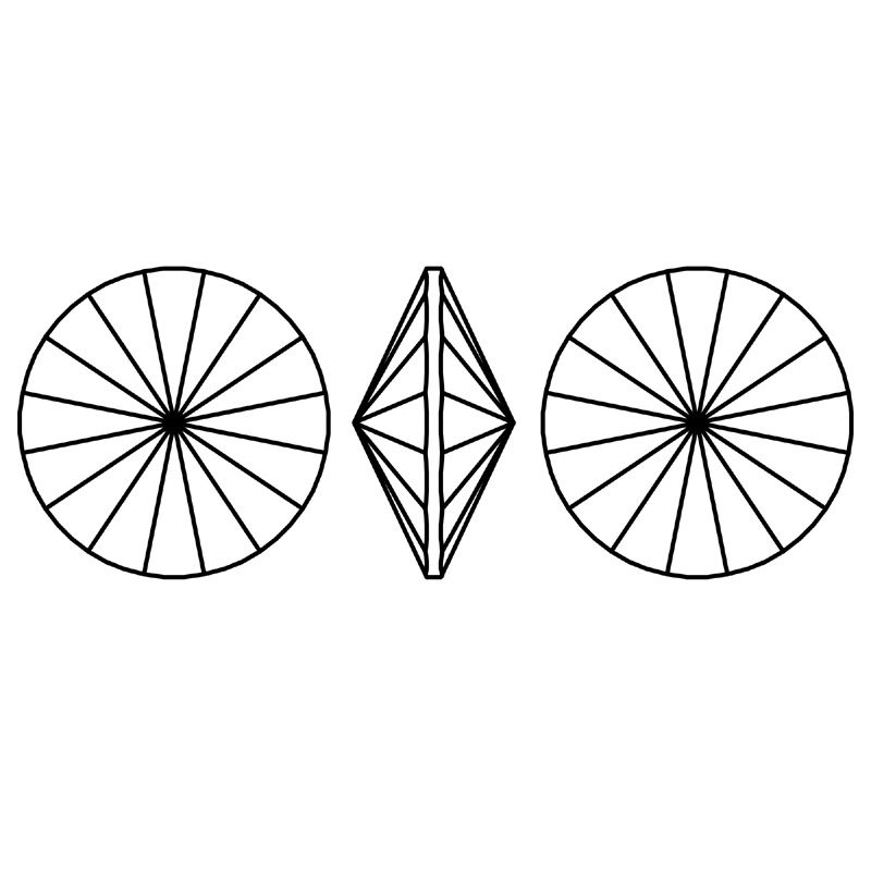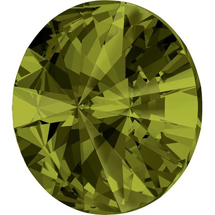 Piedra redonda tipo Rivoli de color Olivine F. Se caracteriza por su forma simétrica y un tono verde intenso con un brillo definido. Utilizada en joyería, elementos decorativos y proyectos creativos donde se requiere un color marcado y una forma clásica de piedra.