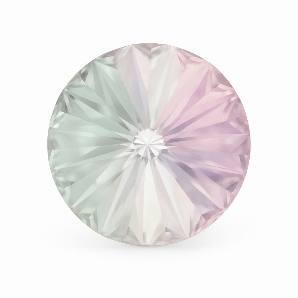 Piedra Rivoli redonda de 10,75 mm en el color Crystal VL. El corte facetado radial distribuye la luz de forma uniforme y crea un sutil efecto visual multicolor. Ideal para joyería artística, monturas y proyectos decorativos elegantes. El corte simétrico funciona tanto en composiciones simples como complejas.