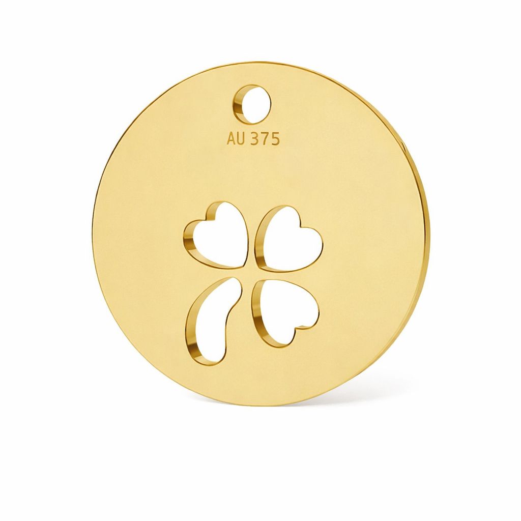 El colgante redondo tipo placa con motivo de trébol en oro AU 375 es un semifabricado sutil de carácter decorativo. El símbolo de la suerte es adecuado para joyería diaria y diseños simbólicos.