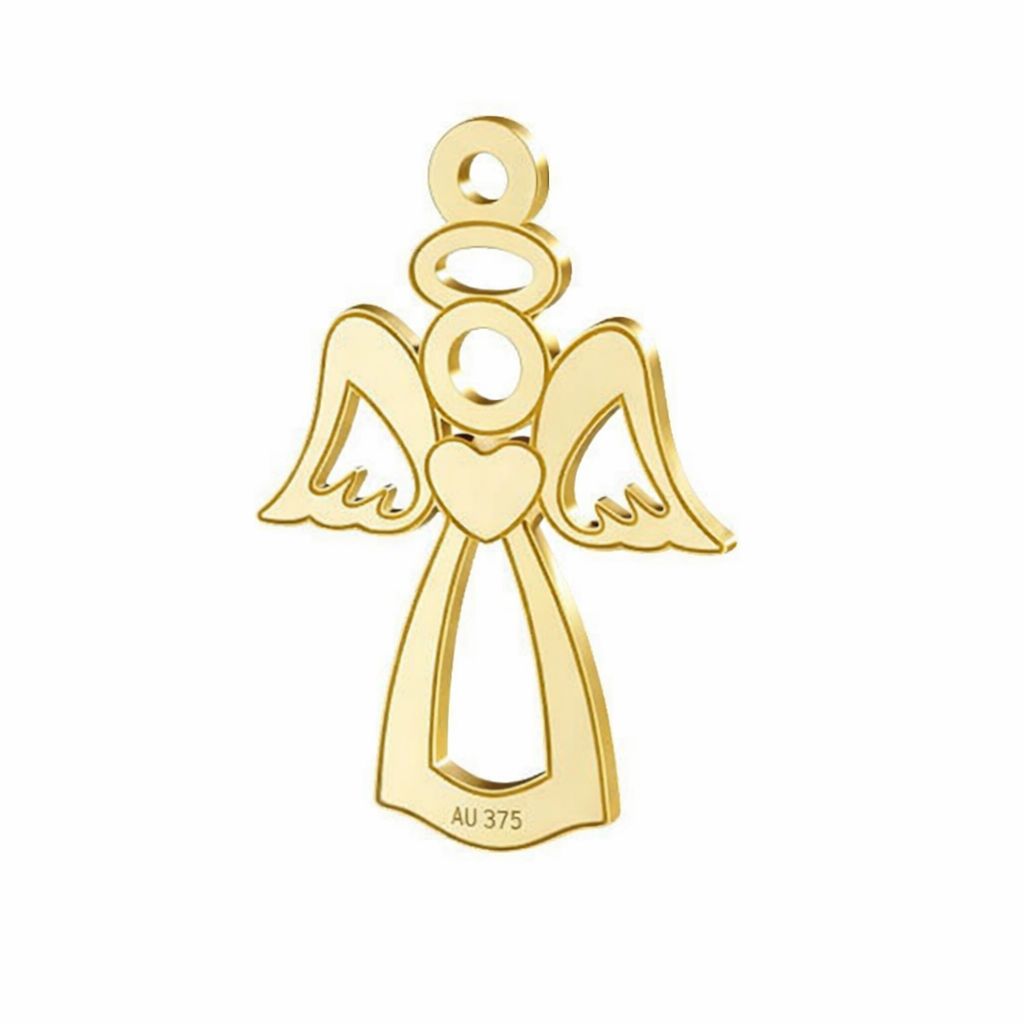 El colgante calado con motivo de ángel en oro AU 375 es un semifabricado decorativo de forma ligera y delicada. El símbolo de protección y esperanza es adecuado para joyería conmemorativa y sentimental.