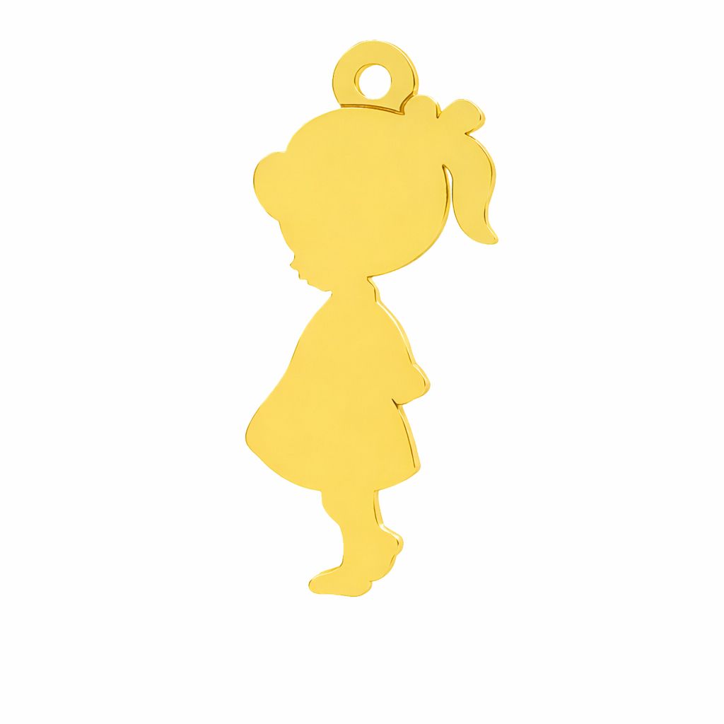 El colgante niña es un motivo delicado con forma de silueta infantil. Fabricado en latón, con superficie lisa y pequeña anilla para colgar. Ideal para collares, pulseras y joyería con significado familiar.